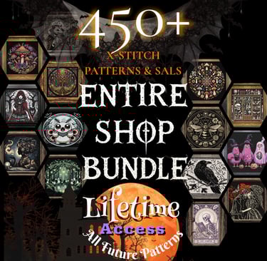 I offer you a key to my forbidden archive. a life-time communion with the dark arts of cross-stitch. Like a deal with the devil himself, this unholy bargain grants you access to:
